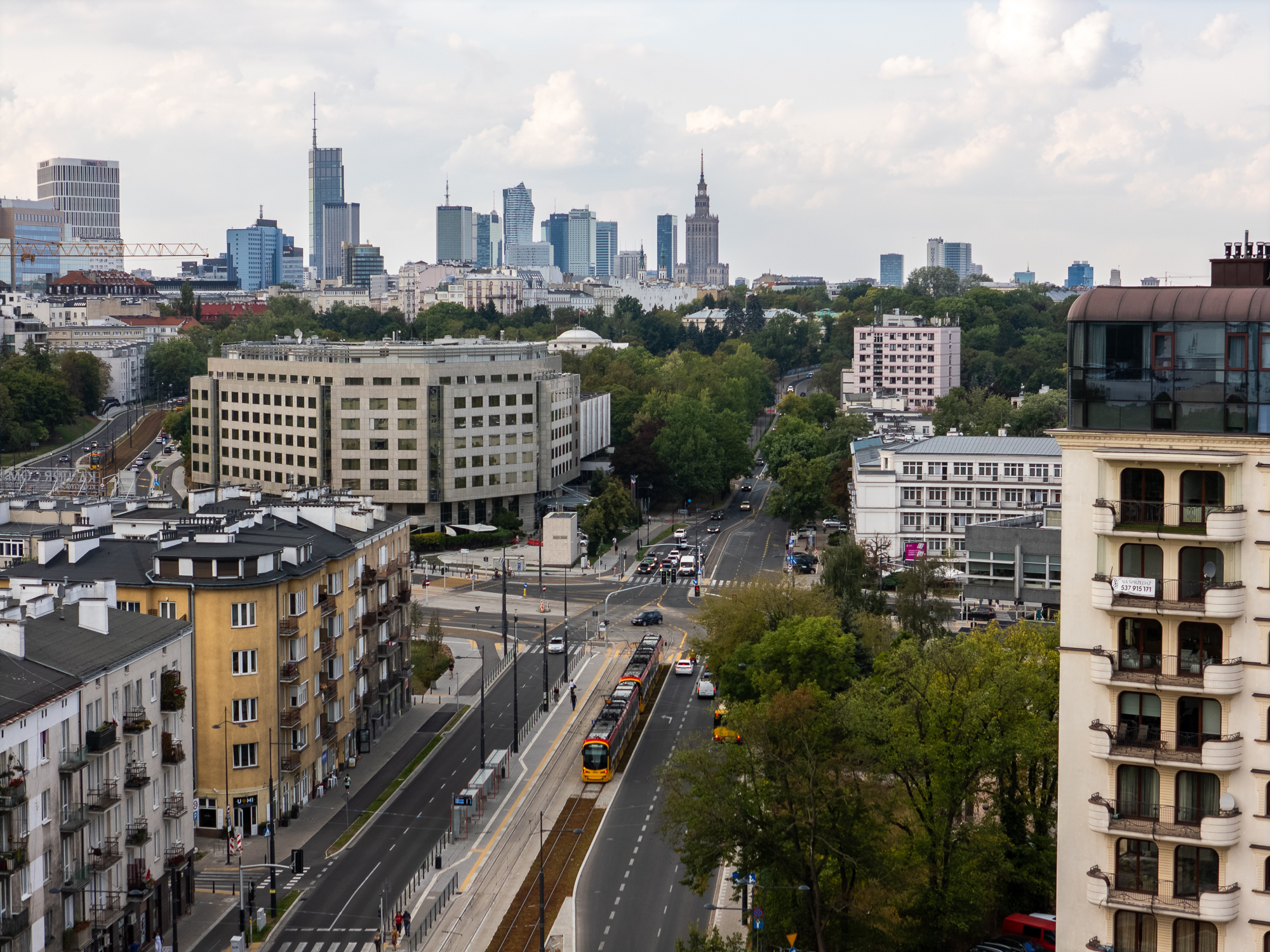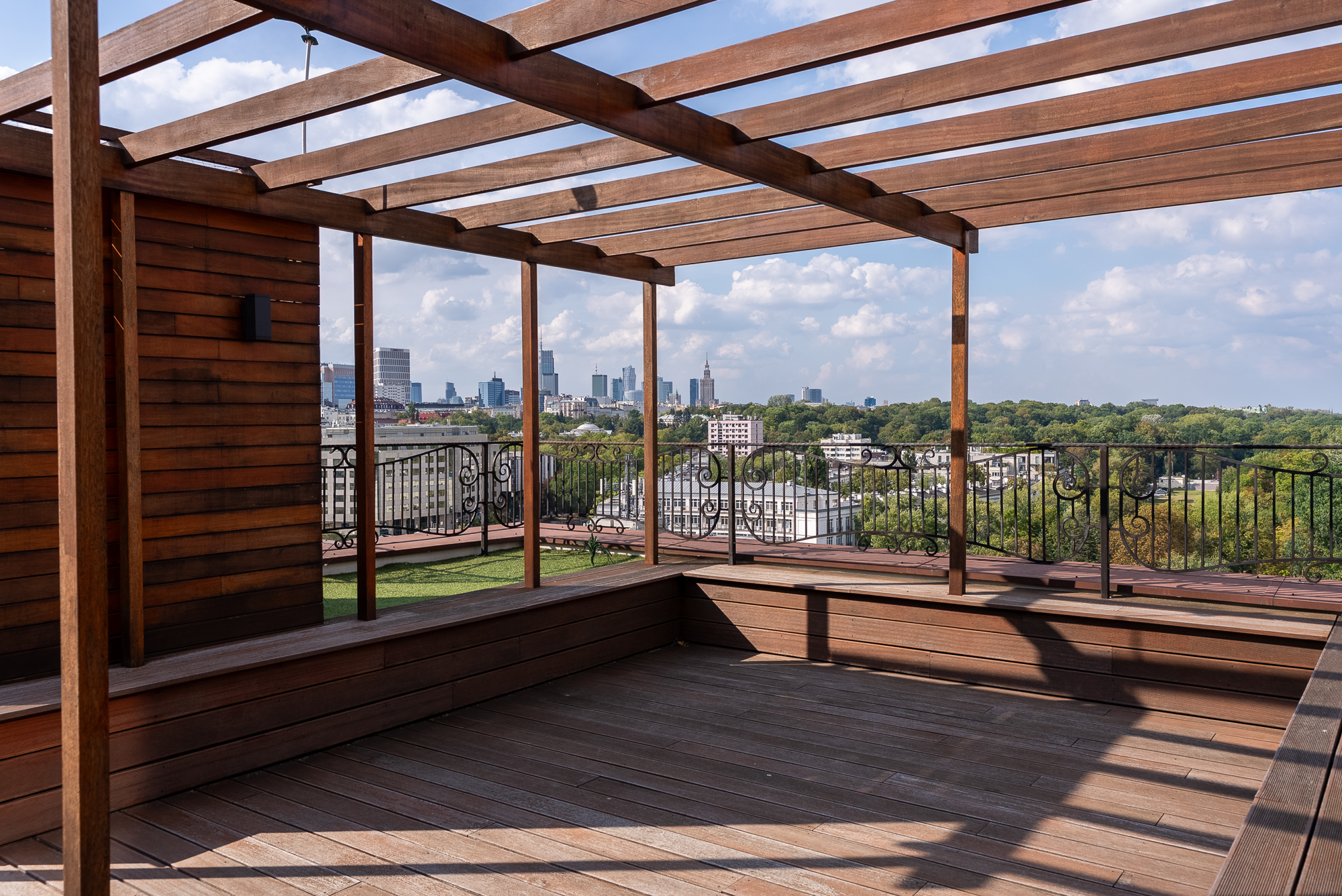 – taras widokowy ze spektakularnym widokiem na panoramę Warszawy – z Pałacem Kultury i nowoczesnymi wieżowcami w tle,