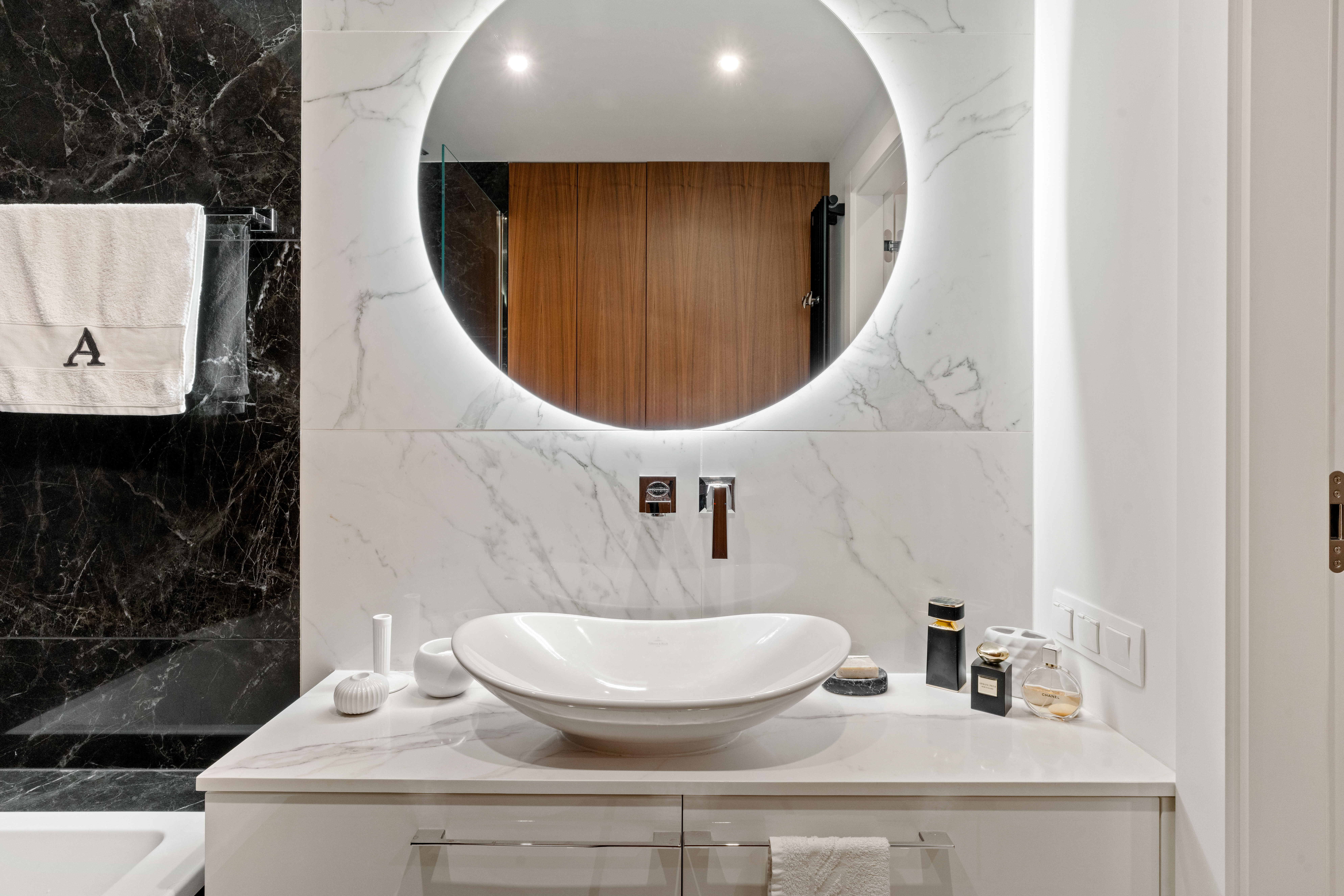 Łazienka została zaprojektowana z dbałością o każdy szczegół. Zabudowa stolarska z forniru obejmuje zarówno ścianę, jak i szafkę pod umywalką, wprowadzając ciepło naturalnego drewna do wnętrza. Blat pod umywalką wykonano z trwałego konglomeratu. Pomieszczenie wyposażono w wysokiej jakości armaturę marki Grohe oraz ceramikę Villeroy & Boch – wannę, umywalkę i WC.