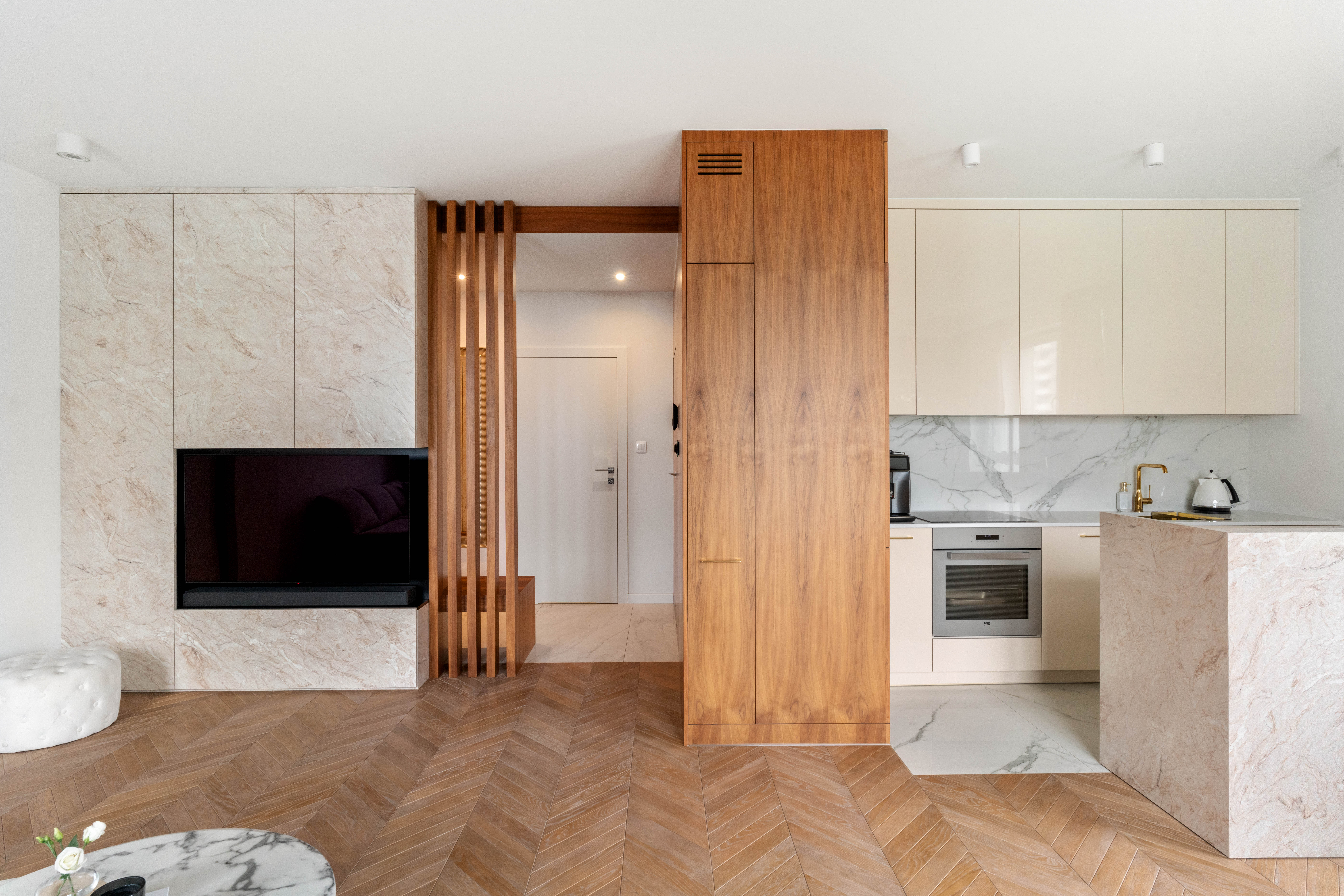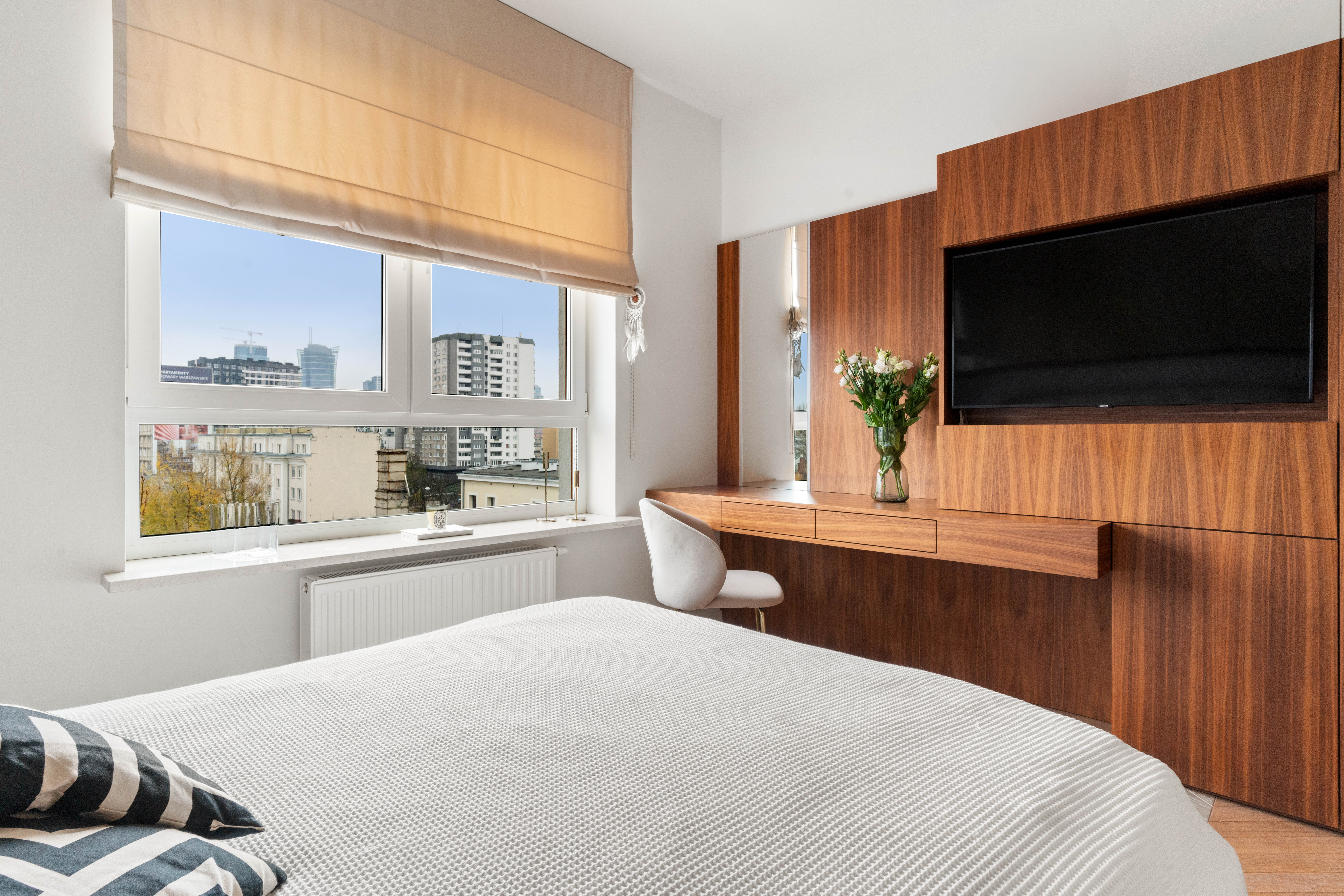 Mieszkanie posiada meble wykończone pod wymiar w każdym pomieszczeniu.
