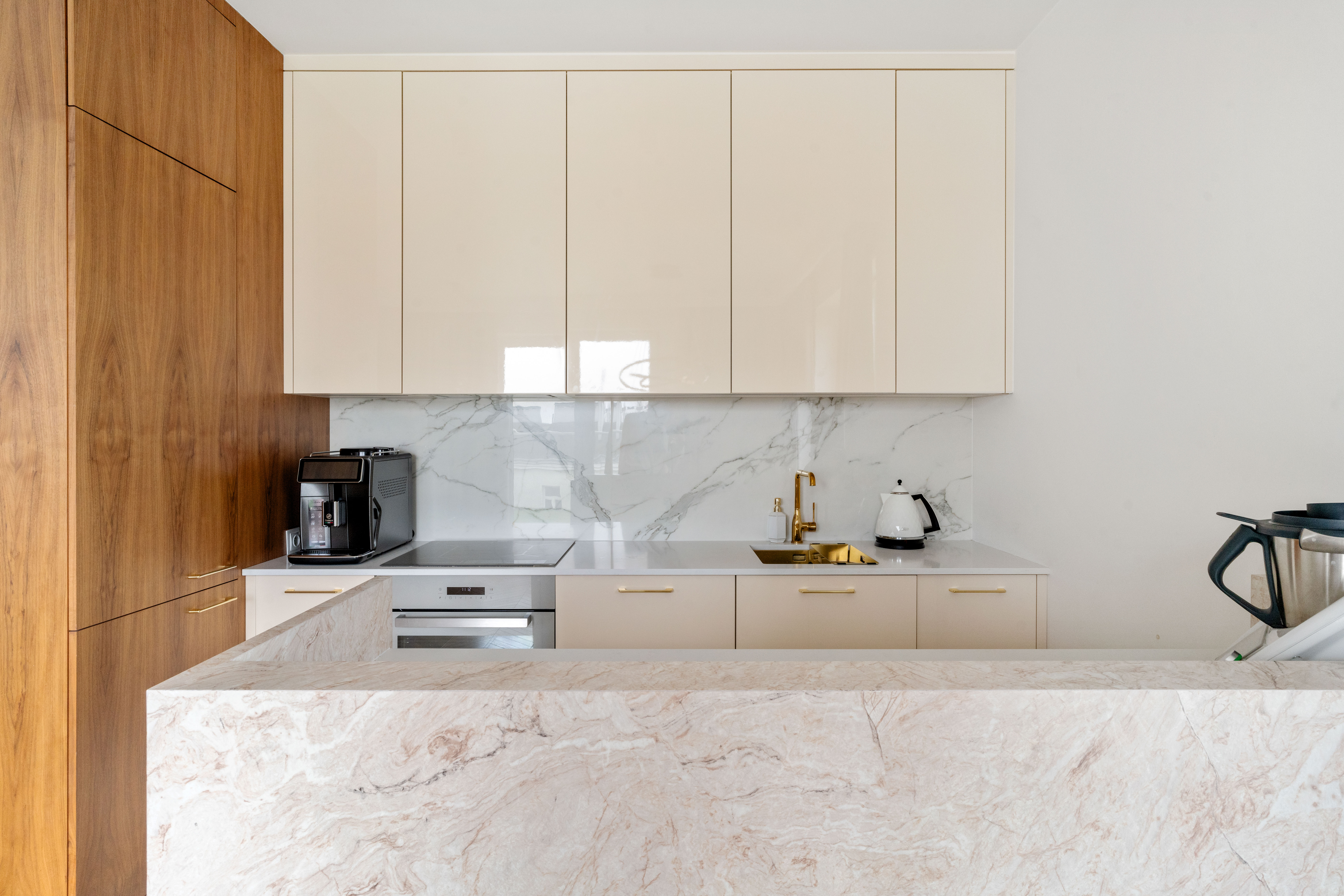 W kuchni oprócz zabudowy stolarskiej znajduje się lodówka oraz pozostały sprzęt RTV (zmywarka, płyta indukcyjna, piekarnik, mikrofalówka).